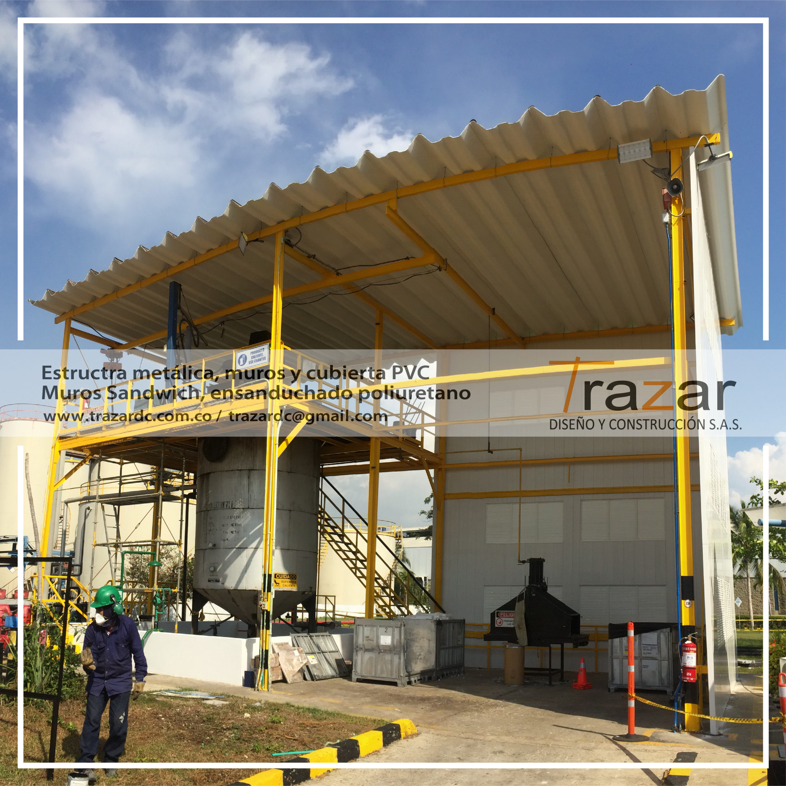 Se realizan diseños y construcción en estructura metálica, obra civil y materiales PVC y Panel Sándwich con Poliuretano para el sector Industrial, con el fin de dar cumplimiento a los diferentes requerimientos y normativas del sector. Construyendo muros de cerramiento, cubiertas, cuartos de químicos, garitas de control y vigilancia, cuartos técnicos, cuartos de residuos, cubiertas, estructuras metálicas.